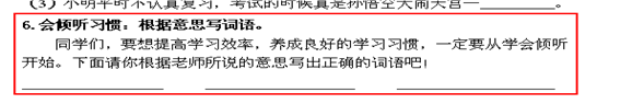 我们在日常的“倾听”习惯训练中发现,“听做”比“看做”更能使学生专注于题目上。而在质量检测中这样考察的紧张感更要求学生对字词等基础知识的把握必须牢固。