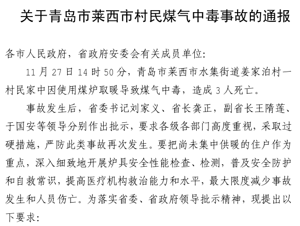 【警钟长鸣】转发省安委会《关于青岛市莱西市村民煤气中毒事故的通报》
