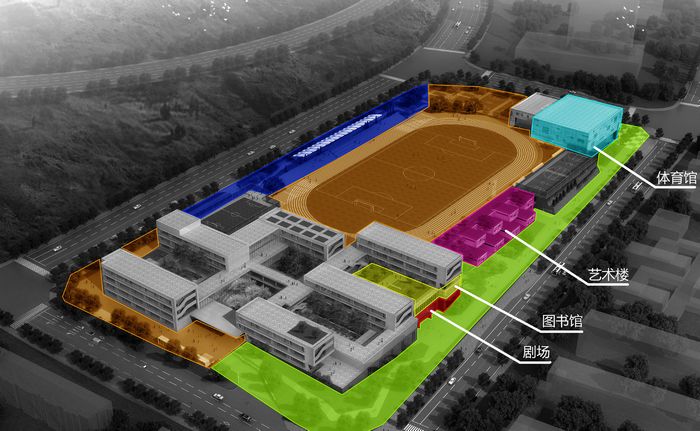 打破传统校园功能分区明确、封闭管理的模式,资源利用最大化。由剧场、图书馆、艺术楼、体育馆构成的整个艺体中心,面向社会开放。东侧临界设计为对外开放的多功能入口,人性化的设计方便居民使用,恢弘的地景式建筑与周边环境完美呼应。