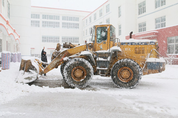 天还未亮,嵩山办事处安排了两辆清雪铲车到校清雪,社区志愿者和老师们也积极投入到扫雪工作中,他们齐心聚力,在学生到校之前将校园主干道及校园周边清扫干净。