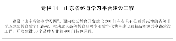 引导高校继续教育转型。以质量提升为目标,以信息技术为支撑,推进高校继续教育转型发展。稳步发展学历继续教育,大力发展非学历继续教育。建设现代远程教育教学平台,开发品牌专业和特色课程等优质教学资源。促进函授教育向现代远程教育过渡。深化高等教育自学考试制度改革。探索建立适合山东实际的个人学习账号、学习成果认证和学分积累转换制度,搭建终身学习“立交桥”。