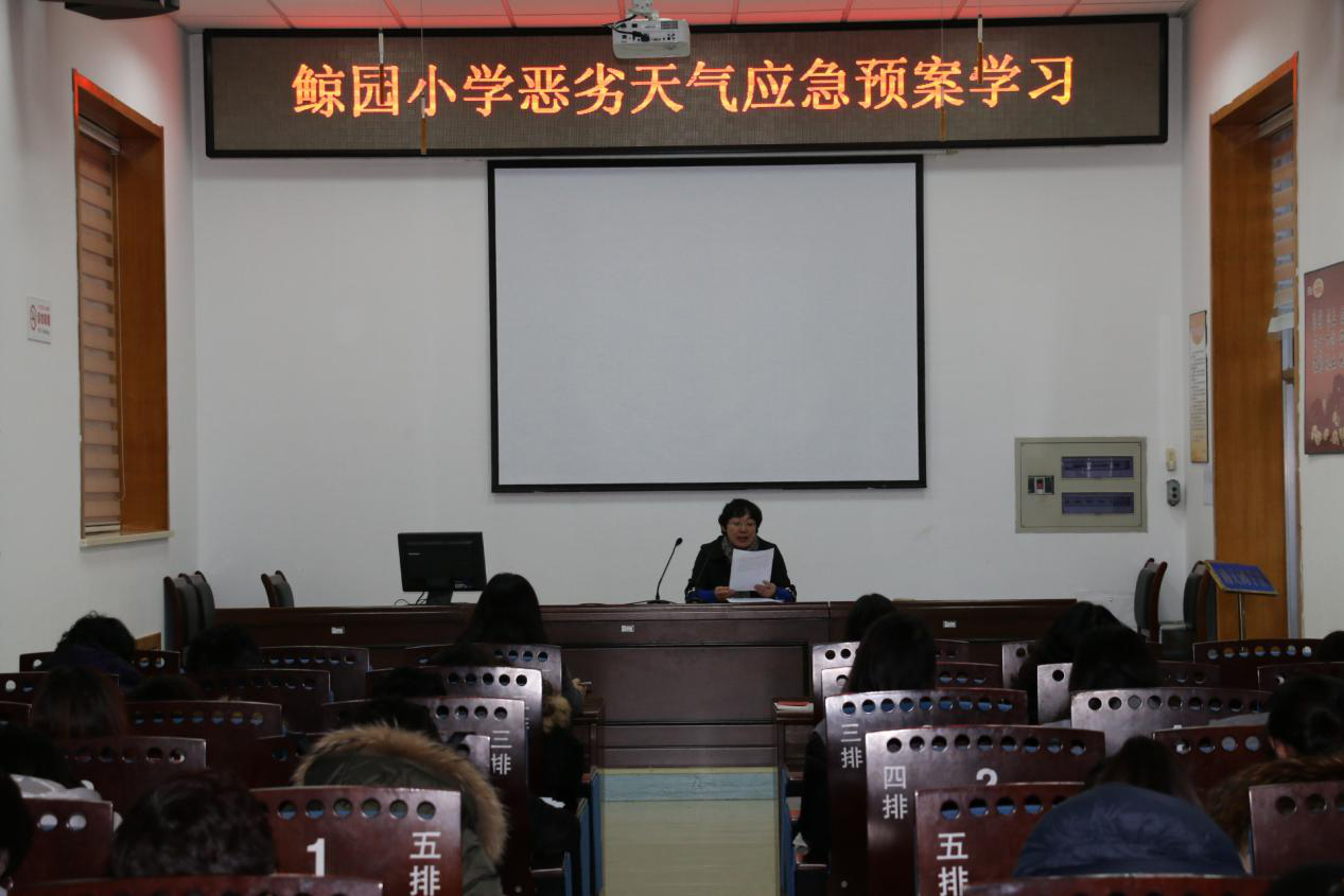 12月5日下午,鲸园小学召开全体教师大会,李泽红副校长带领大家学习《鲸园小学恶劣天气应急预案》。
