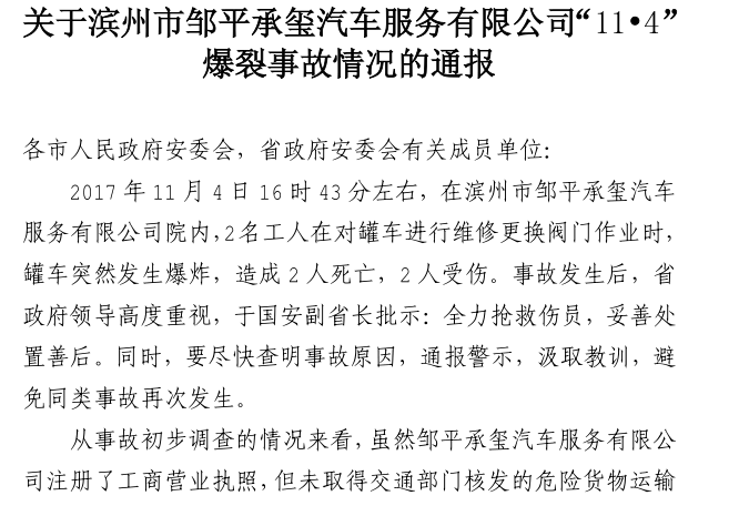 【警钟长鸣】转发省安委会《关于滨州市邹平承玺汽车服务有限公司“11? 4 ”爆裂事故情况的通报》