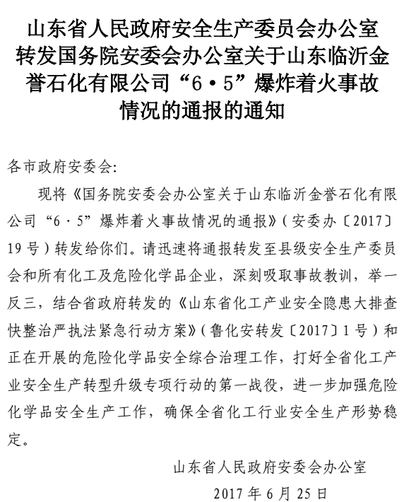 转发省安委会关于临沂金誉石化“6.5”爆炸着火事故情况的通报通知