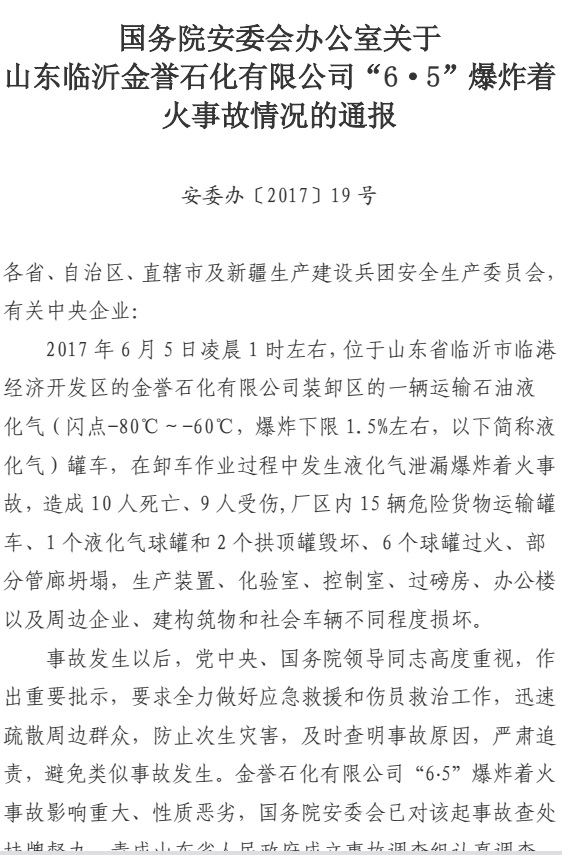 现将《山东省人民政府安全生产委员会办公室转发国务院安委会办公室关于山东临沂金誉石化有限公司“6.5”爆炸着火事故情况的通报的通知》转发你们,请汲取事故教训,做好各项工作措施的落实。