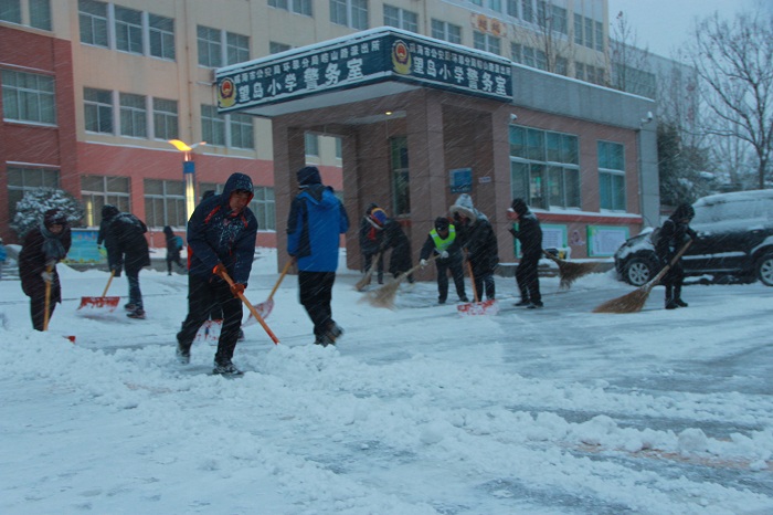 2018年1月10日普降瑞雪,为了确保孩子们的生活和学习不受雪天路滑的影响,望岛小学的老师和家长志愿者们清晨6点便到校清扫积雪。大家干劲十足,你铲我扫,分工明确,忙碌的身影构成了冬日校园一道靓丽的风景线。